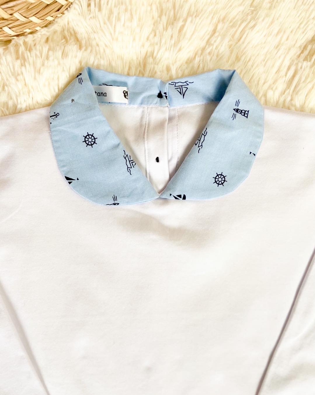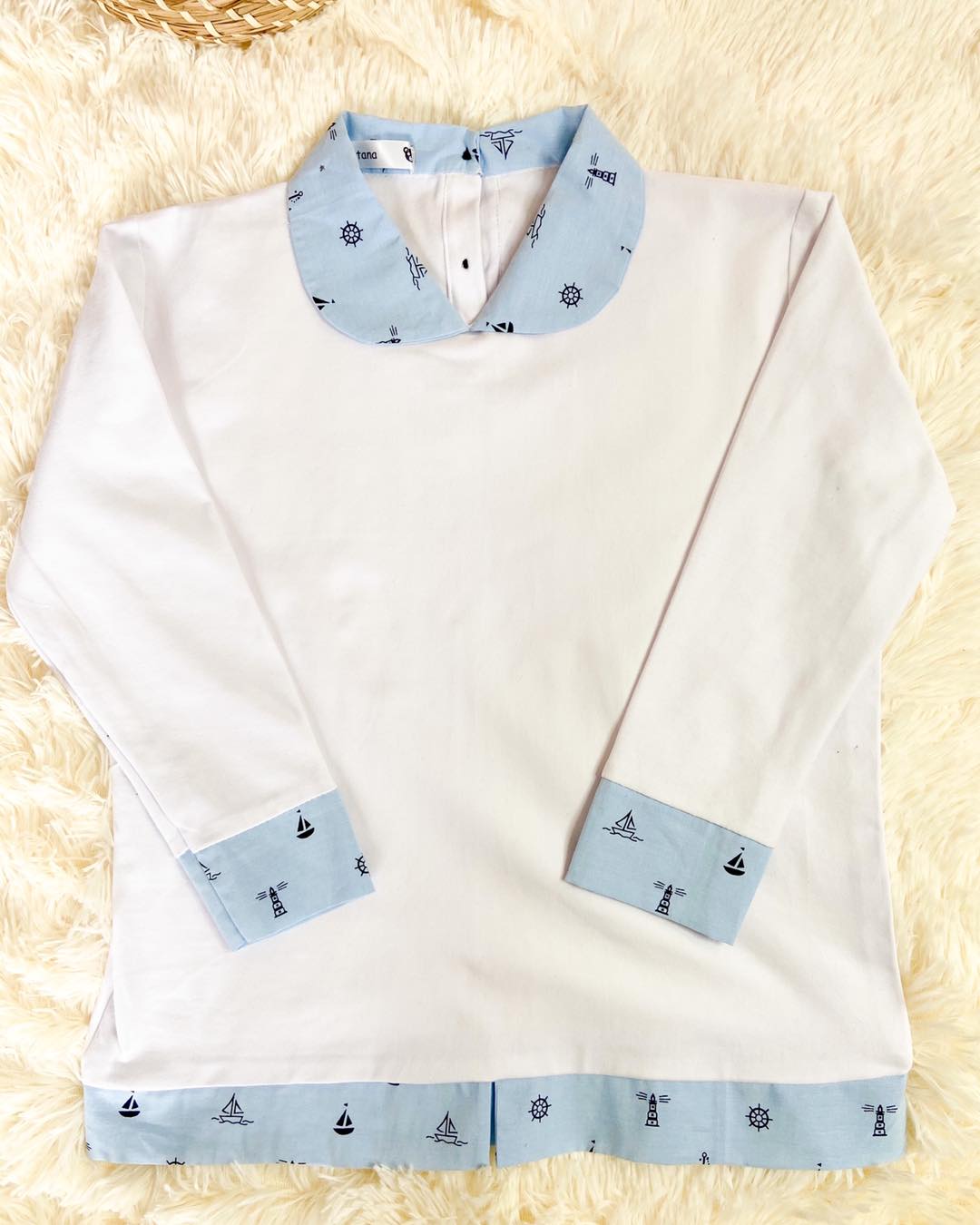 Chemise blanche en lin au col fleuri bleu
